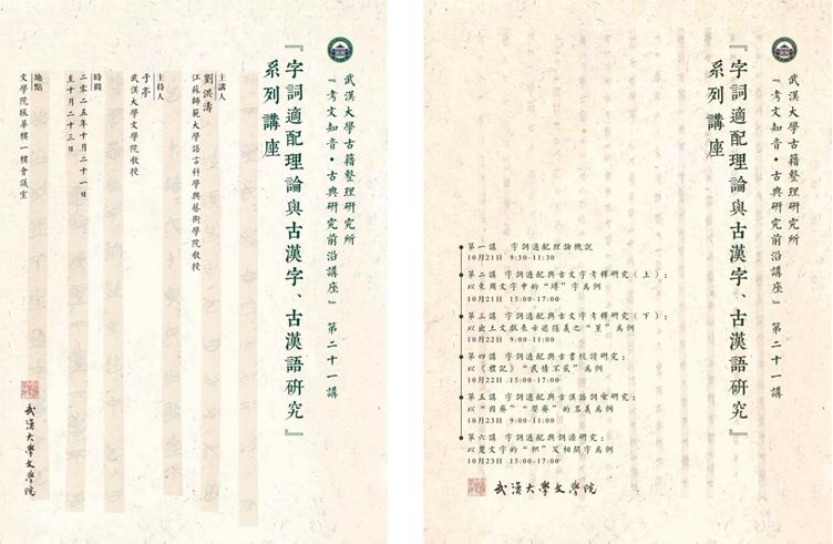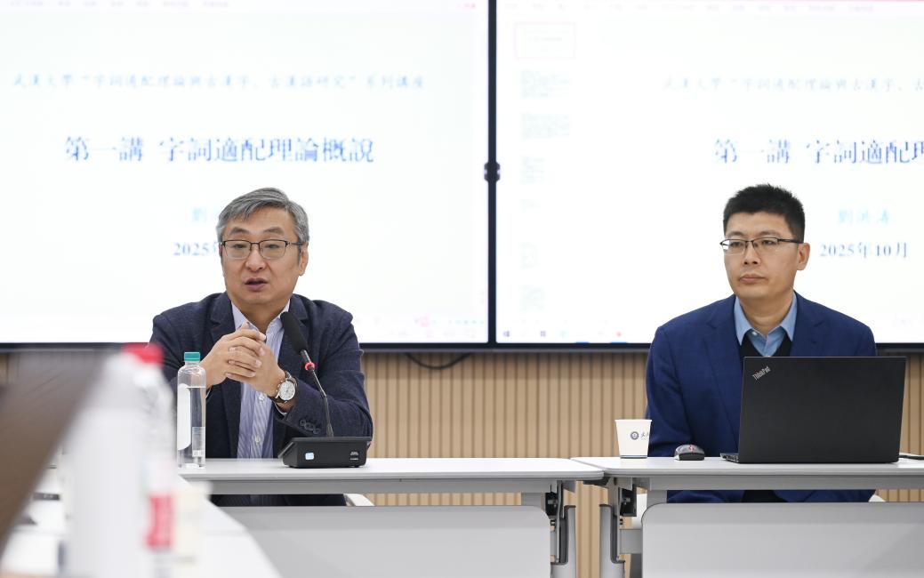 2025年10月21日至23日,武汉大学古籍整理研究所“考文知音·古典研究前沿讲座”第二十一讲在足球博彩网站 振华楼一楼会议室举行,江苏师范大学语言科学与艺术学院刘洪涛教授应邀主讲了“字词适配理论与古汉字、古汉语研究”系列讲座。刘老师结合具体实例,就古文字考释、古书校读、古汉语词汇研究与词源研究等问题展开深入探讨,学术视野开阔,内容前沿。来自足球博彩网站 、历史学院及其他学校的老师、同学参加了此次讲座。