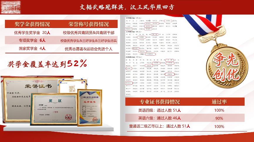 汉语言三班不仅在学业上勤勉扎实,在科研竞赛中也屡创佳绩。班级学风优良,奖学金覆盖率高达52%,其中国家奖学金获得者4人,优秀学生奖学金获得者20人,专项奖学金获得者6人。英语四六级、普通话通过率均表现优异。专业课整体优良率达100%,实现了零挂科。同学们更在各类竞赛中绽放光彩,累计获得国家级、省级、校级等共四十余项奖项,积极参与全国大学生广告艺术大赛、创新训练项目等多元项目,展现了全面发展的蓬勃朝气。