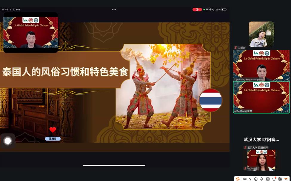 中国学生的展示同样精彩纷呈。大家围绕武汉城市文化、中国传统乐器琵琶、特色饮食糊涂粥、大学生养生八段锦四大主题展开分享,从历史底蕴、艺术魅力、饮食特色到传统养生智慧,全方位、多角度展现中国文化的独特魅力。其中,琵琶现场演奏、八段锦互动教学的环节,更是给泰方师生留下深刻印象,收获线上听众的频频点赞。
