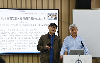 第二场讲座题为“从《古音汇纂》看隋唐汉语的浊上变去”,由李广宽副教授主持。讲座中,孙老师谈到,自己在写博士论文的时候就已经发现了一些浊上变去的现象,并举了韩愈《讳辩》、李涪《刊误》中的具体例证,说明唐朝、至少是中唐以后,是明显存在浊上变去的现象的。孙老师强调,研究汉语语音史,不能只掌握一个方面的材料,或者只采取一种视角进行研究,正是有足够多的材料支撑,才能得出隋唐时已经有浊上变去这个结论。之后,孙老师介绍了自己利用《古音汇纂》研究浊上变去的方法。对直音来说,如果我们确认一个被注音字原来一直是全浊上声字,后来用去声字给它注音,那么可以断定这个被注音字在注音时已变成去声字;如果我们确认一个被注音字原来一直是去声字,后来用全浊上声字给它注音,那么可以断定这个注音字在注音时已变成去声字。对反切来说,如果我们确认一个被注音字原来一直是全浊上声字,后来用去声字的切下字给它注音,那么可以断定这个被注音字在注音时已变成去声字;如果我们确认一个被注音字原来一直是去声字,后来用全浊上声字给它做切下字,那么可以断定这个切下字在注音时已变成去声字。此外,还有其他补充方法,如《慧琳音义》引用《玄应音义》时,有时会改动音切用字,其中涉及全浊上字与去声字的交替,据此可以用来证明浊上变去。需要注意的是,这些都是必要条件。因为还可能会出现异读的情况,所以,做学问的时候,逻辑很重要,要想得复杂一点。接下来孙老师把从《古音汇纂》搜集到的材料按全浊声母分类,向同学们讲解。通过大量的例子得出结论,唐代是全浊上声变去声的大规模变动时代。最后,孙老师补充道,魏晋南北朝也有零星的浊上变去的例子,但是数量比较少,声母上覆盖率不高,也不清楚跟后来的浊上变去性质是否相同,可能是在系统性出现浊上变去之前,全浊上声字和全浊去声字构成异读。总之,还需要更强有力的证据进行证实或证伪。但是隋唐时期,我们搜集到的材料声韵的覆盖率都相当高,因为《古音汇纂》的出版,材料涉及的文本范围也很广。