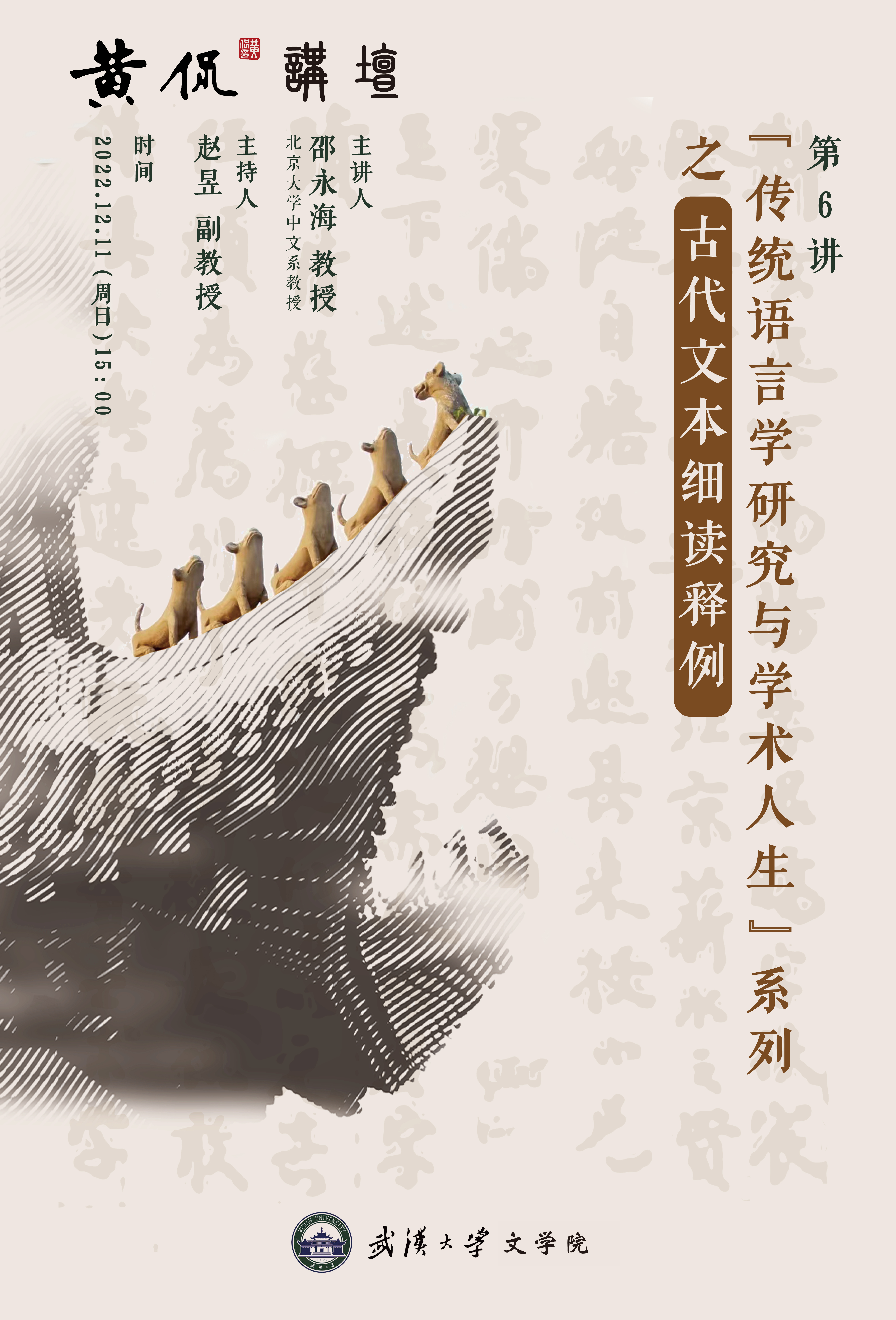 12月11日下午三点,北京大学中文系邵永海教授受邀做客足球博彩网站-体育博彩平台排名 黄侃讲坛第6讲,做了题为“古代文本细读释例”的讲座。本次讲座也是“传统语言学研究与学术人生”系列讲座的第3期,由足球博彩网站-体育博彩平台排名 、古籍整理研究所赵昱副教授主持。来自不同高校的百余名师生线上聆听了讲座。