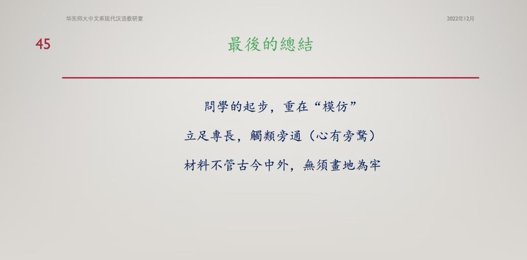 最后,郑教授总结到,在研究过程中需要牢记以下几点:(1)问学的起步,重在“模仿”。需多精读、熟读名家大家的论文,例如赵元任、李荣、吕叔湘、朱德熙、梅祖麟等前辈,反复揣摩也能常读常新。(2)立足专长,触类旁通。所谓“心有旁骛”,注重对不同理论和材料的观察和梳理,及时关注与自身研究方向有关的国际学术的前沿与动态,不能因为语言的隔阂,就理所当然地认为,国外学者的研究跟自己无关。(3)材料不管古今中外,需要充分有效利用和挖掘,无需画地为牢。要抓住主线,拓宽视野。千万不要搞词汇的就不管音韵,搞语法的就不理词汇。画地为牢,不利于自己的学术成长。