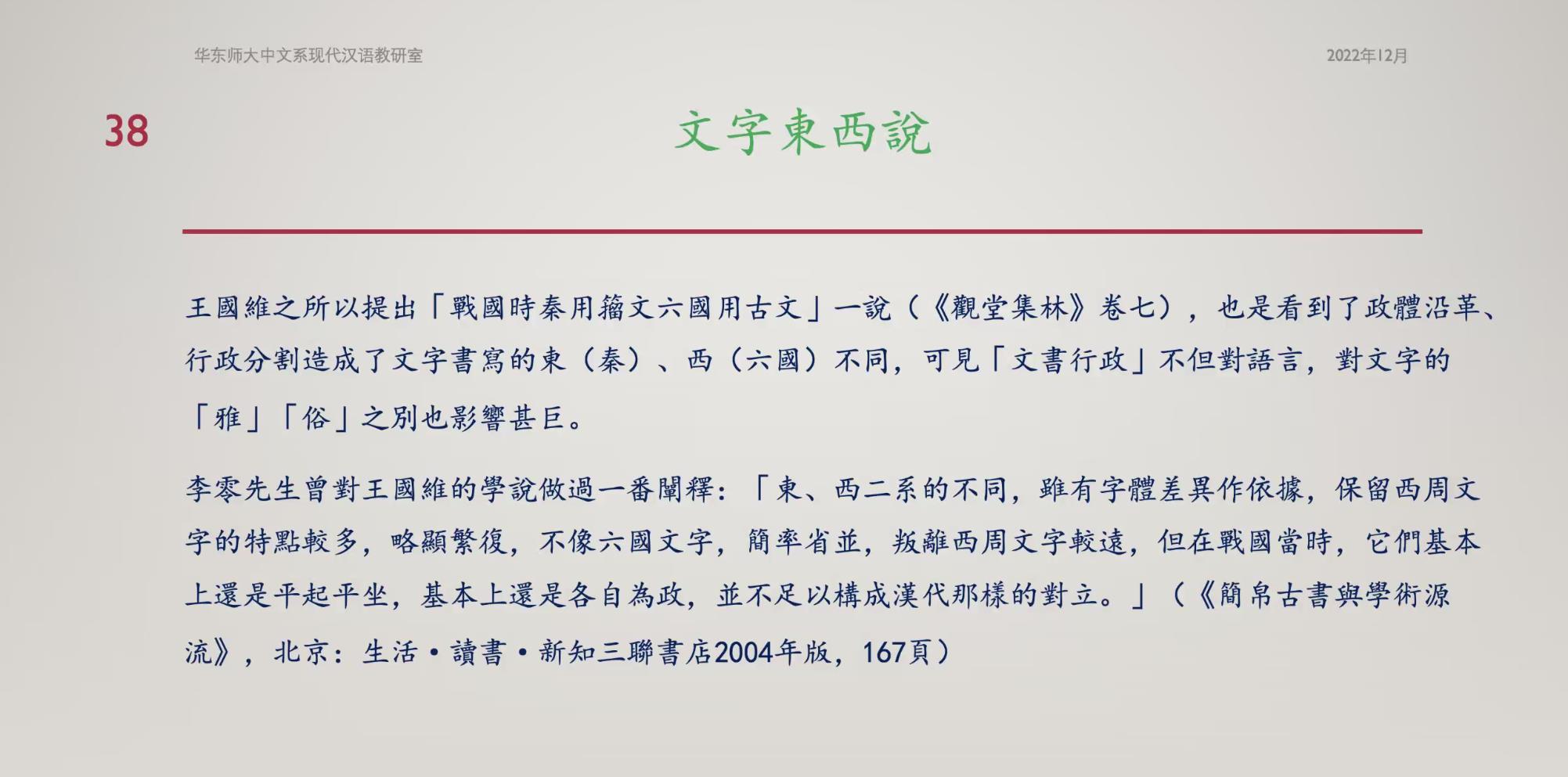 在对上述两点分析后,郑教授认为,“雅言”与“夷夏之辨”“华夏正音”等话题密不可分,这也是近年来自己逐渐拓展的研究。王国维《殷周制度论》、傅斯年《夷夏东西说》《姜原》、陈寅恪《东晋南朝之吴语》等相关论述,都说明了自先秦以来,戎夷和南朝都存在“双言制”,正是“雅言”作为中华民族文化基因传承纽带,在民族交融和交往过程中,起到十分重要的桥梁作用,这也说明了中国是个民族与文化多元一体的国家这一事实。