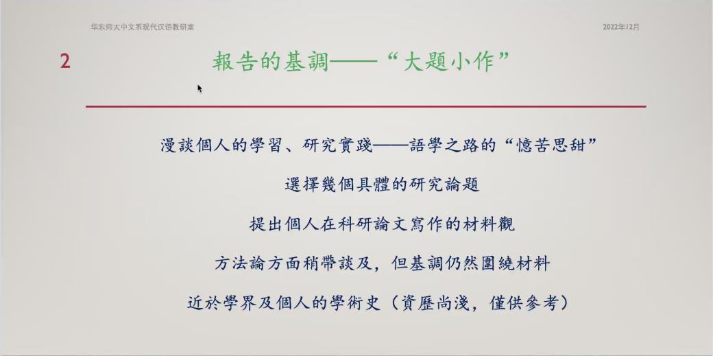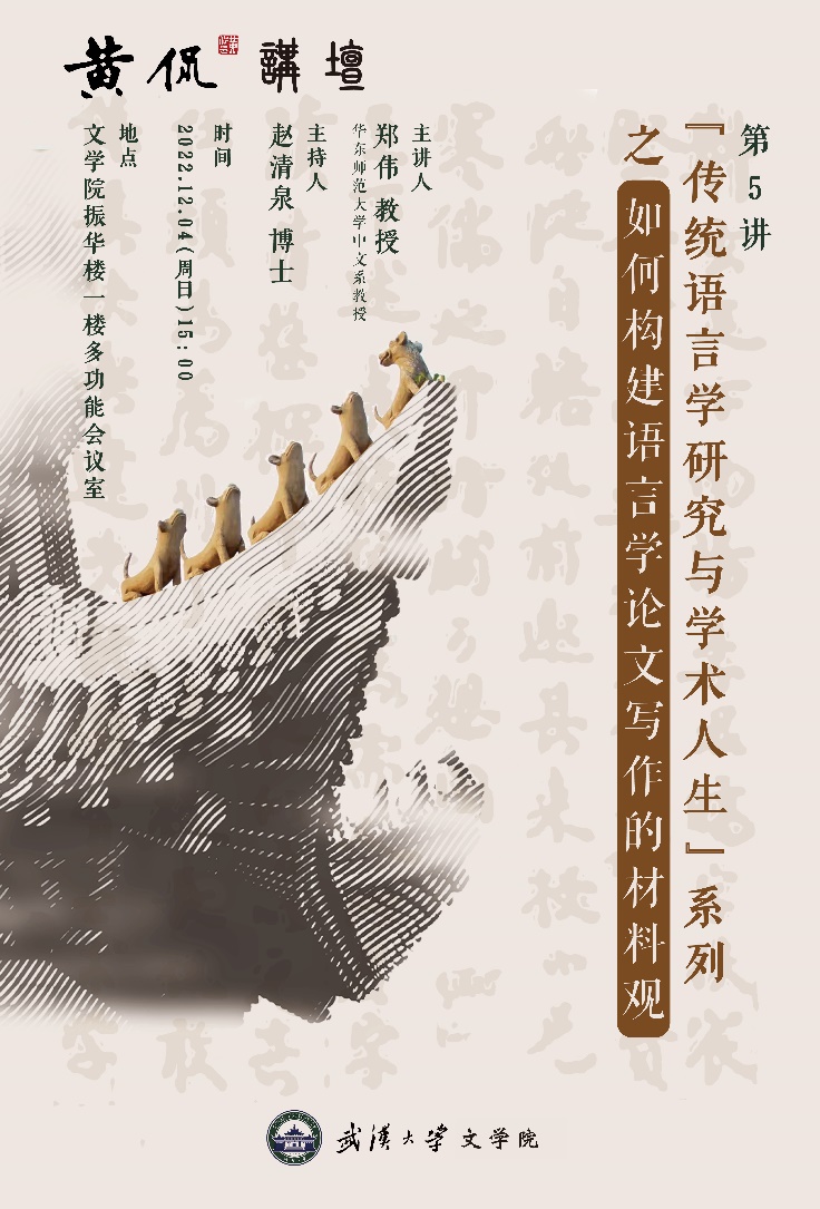 12月4日15点,华东师范大学中文系郑伟教授线上做客足球博彩网站-体育博彩平台排名 “黄侃讲坛”,做题为“如何构建语言学论文写作的材料观”的讲座,本次讲座是“黄侃讲坛”第5讲,也是“传统语言学研究与学术人生”系列的第2期,由赵清泉老师主持。两百多名师生线上聆听了讲座。
