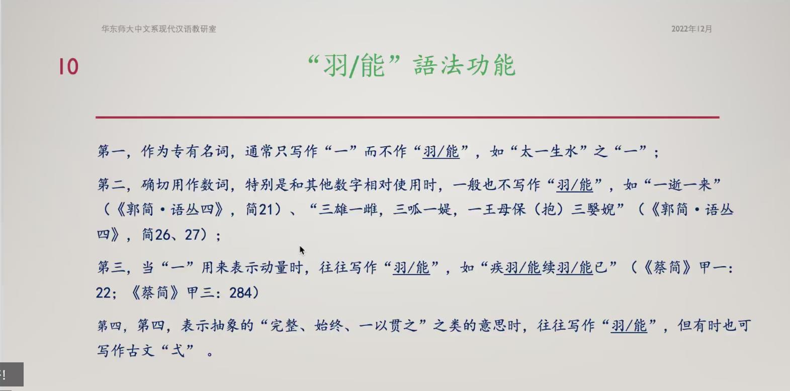 郑教授先以他2007年发表在《中国语文》的《古代楚方言“羽/能”字的来源》一文写作经历为例,说明观念和材料的重要性。虽然日本学者林虹瑛2004年在《开篇》已发表了《战国文字(羽能)について》一文,说明了楚系出土文献记录了古越语“一”的读音,但该文论述仍未细密且未能引起国内学者注意。作为楚系文献中的常用字,朱德熙、李家浩(1989)、裘锡圭(1992)等分别认为与“代”(之部)、揖(缉部)等字关系密切,但从声韵看还仍有一定距离。因此郑教授认为,当另辟蹊径:“能”字是古越语语素“一”nɯŋ的记录。通过与侗台语“一”的比较及其语法功能的排比,也充分证实了自己的猜想。由此也启发我们,在考证先秦出土文献用字时,如果通过汉语本身寻求“内证”而不可得时,可进一步考虑是否可能是古楚越方言的孑遗,即南方汉语可能呈现的是通语与楚地方言并存的局面。