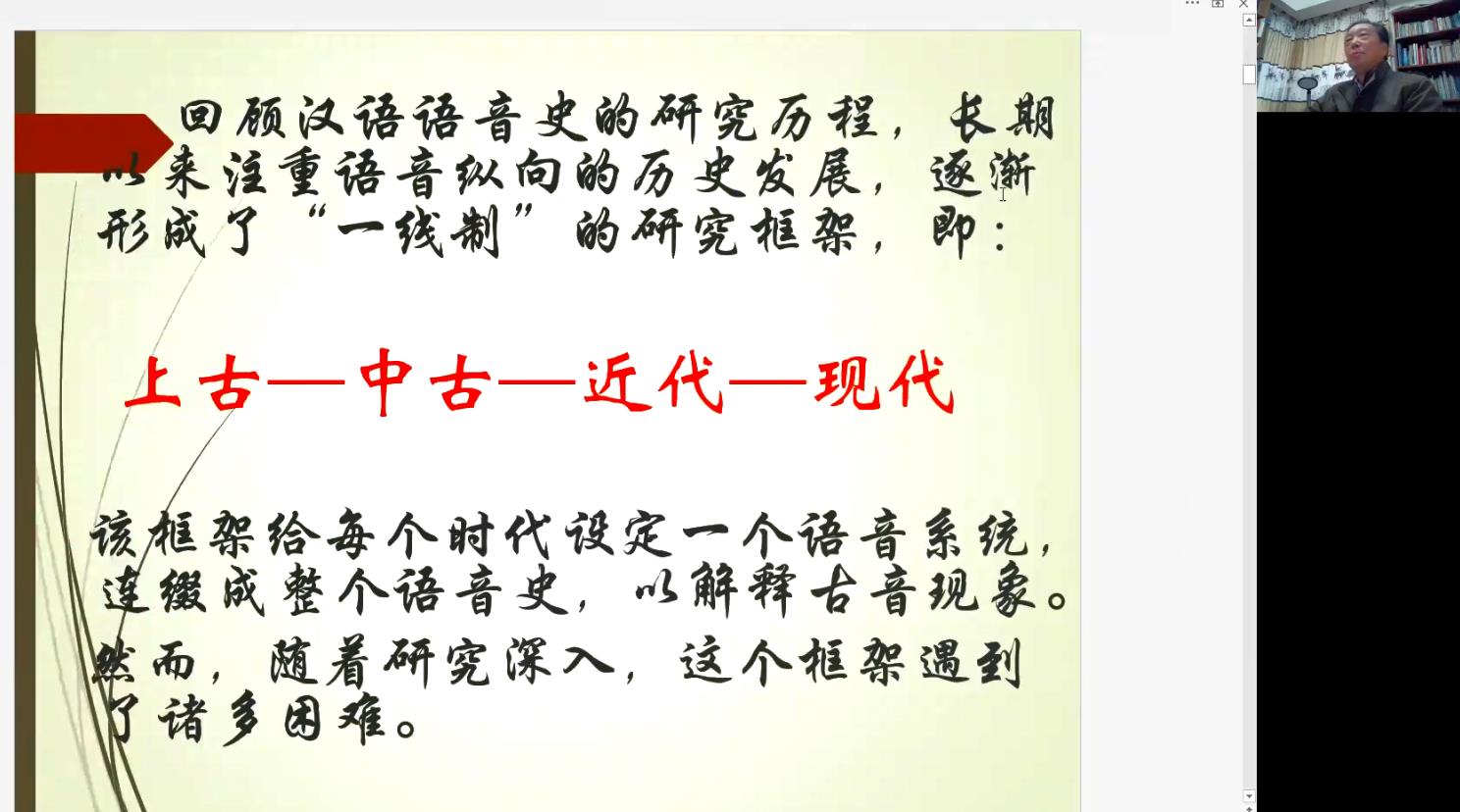 讲座伊始,刘晓南教授谈到随着研究深入,汉语语音史在研究中形成的“一线制”(上古-中古-近代-现代)框架遇到了诸多困难。因此现代音韵学者逐渐认识到历史方音是语音史研究绕不开的坎。