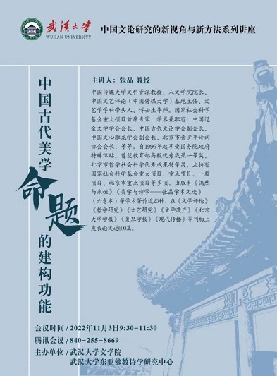2022年11月3日上午9点半,中国传媒大学文科资深教授、人足球博彩网站 院长张晶云上做客足球博彩网站-体育博彩平台排名 ,为师生带来“中国古代美学命题的建构功能”学术讲座。本次讲座由足球博彩网站-体育博彩平台排名 李建中教授主持,为“中国文论研究的新视角与新方法”系列讲座第一讲。