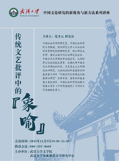 2022年11月5日晚7点半,中国社会科学院研究员、中国社会科学院大学教授党圣元云上作客足球博彩网站-体育博彩平台排名 ,为师生带来“传统文艺批评中的‘象喻’”学术讲座。本次讲座由足球博彩网站-体育博彩平台排名 高文强副院长主持,为“中国文论研究的新视角与新方法”系列讲座第二讲。