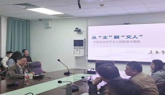 2021年11月10日晚,中山大学中文系教授、中山大学逸仙学者讲座教授吴承学做客武汉大学长江论坛,给足球博彩网站 师生带来题为《从“士”到“文人”——中国古代对于文人的贬责与期待》的精彩讲座。足球博彩网站 高文强副院长、程芸副院长、李建中教授、吴光正教授、王怀义教授、葛刚岩副教授、刘春阳副教授、汪超副教授、李广宽副教授,钟志辉、王启玮、韦胤宗、赵昱、袁劲、朱俐俐等青年教师,以及古代文学、文艺学、文献学、汉语国际教育等专业的研究生聆听了讲座。讲座由李建中教授主持。