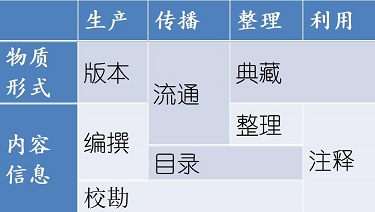 随后,孙老师谈了古文献学的应用研究与历史研究。古文献的应用研究要具体落实到文献学分支探究上。他利用认识文献本体的两条线索,即以文献的构成层次为纵向线索,以文献的生命过程为横向线索来重新划分和整合其分支领域,得到下图: