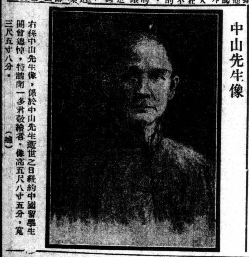 1925 年 3 月 12 日孙中山先生在北京逝世。22 日下午 2 时,纽约华侨在国际学舍隆重举行孙中山先生追悼大会,闻一多绘制的孙中山遗像置放在会场主席台的桌子上。
