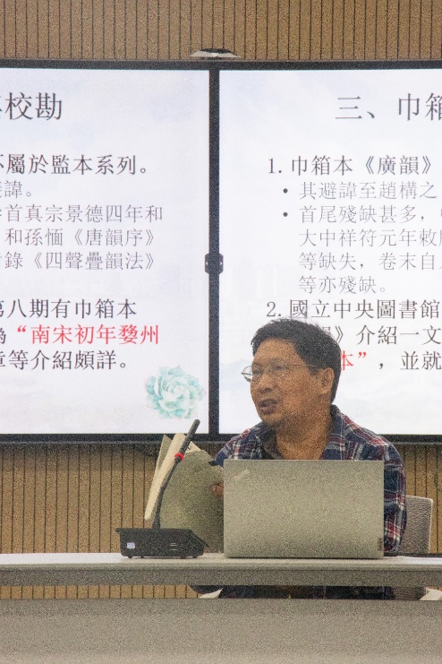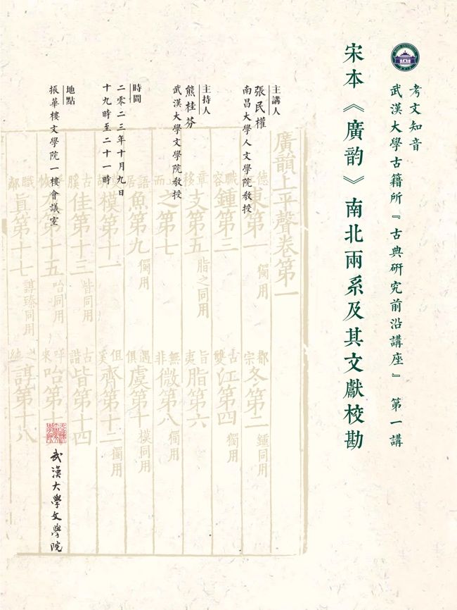 2023年10月9日晚,南昌大学人足球博彩网站 张民权教授应邀为足球博彩网站 师生做题为“宋本《广韵》南北两系及其文献校勘”的学术讲座,该讲座是武汉大学古籍整理研究所主办的“考文知音·古典研究前沿讲座”系列的第一讲。讲座由古籍所熊桂芬教授主持,古籍所李广宽、赵清泉、汉语言文字学教研室陈菡、刘翔宇等老师,以及相关专业学生聆听了讲座。