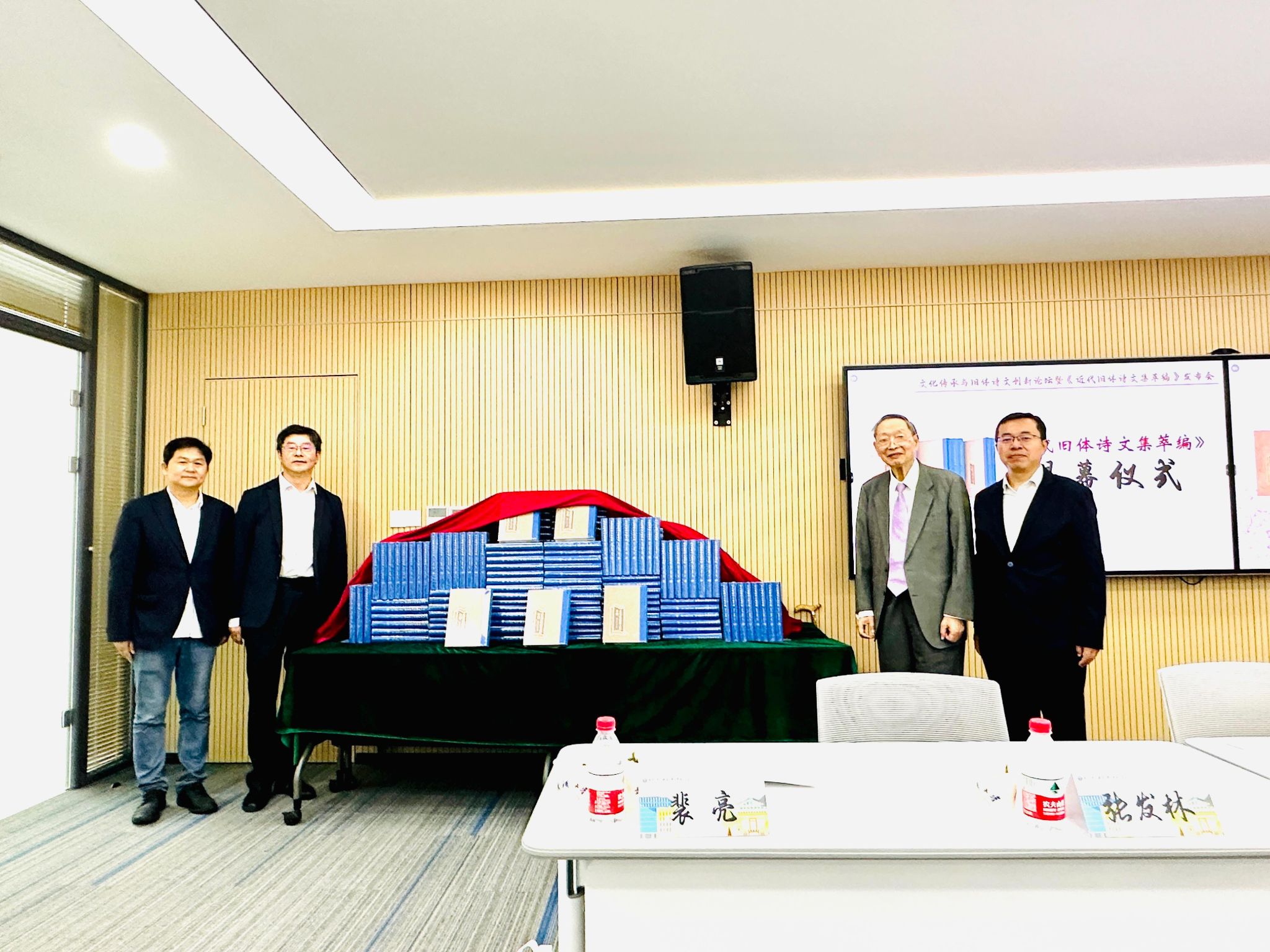 发布会上,朱德友副校长、魏崇社长、杨天石先生与李遇春教授为《近代舊體詩文集萃編》一同揭幕。《近代舊體詩文集萃編》由杨天石、李遇春主编。此套丛书为“十三五”国家重点图书出版规划项目,也是国家社会科学基金重大项目“多卷本《中国现当代旧体诗词编年史》编纂与研究及数据库建设”的阶段性成果。《萃編》主要收录晚清至民国时期政治、经济、文化、教育等各个领域具有一定社会地位及影响力的人物创作的旧体诗文集。成书或刊刻时间主要集中在一九一二至一九四九年间,其中绝大多数为线装书,有刻本、稿本、钞本、铅印本等。《萃編》是对近代旧体诗文集的一次大规模、系统性整理,有着珍贵的史料价值,是当前中国人文社会科学所需重点面对并加紧挖掘和处理的信息源之一。《萃編》内含的大量史料,为重构近现代文学史打开了更为广阔的视野。