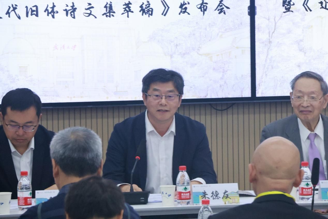 朱德友副校长代表武汉大学对与会专家学者表示欢迎与感谢。他指出,新时代给文艺工作者们提出了新期许和新要求,需自觉担负中国特色社会主义文化建设使命,赓续历史文脉、谱写当代华章。由中国社会科学院荣誉学部委员、著名历史学家杨天石先生和我校足球博彩网站 李遇春教授主编的《近代舊體詩文集萃編》展现了新时代学人传承与建设中华优秀传统文化的巨大勇气,是新时代学人自觉担负新时代新的文化使命的重要体现。
