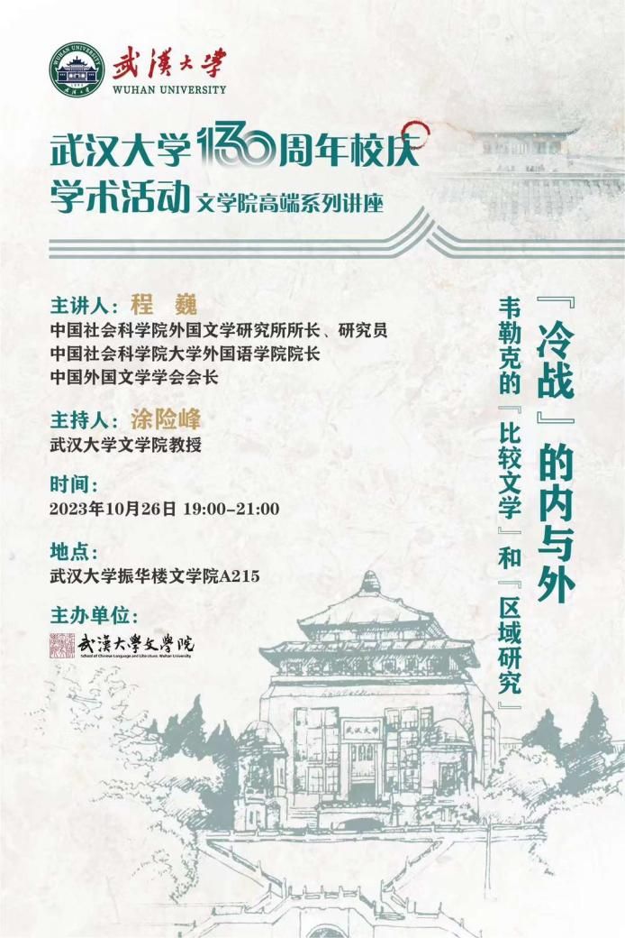 10月26日晚,中国社会科学院外国文学研究所所长、中国社会科学院大学外国语学院院长、中国外国文学学会会长程巍教授应足球博彩网站-体育博彩平台排名 邀请,开展题为《“冷战的内与外——韦勒克的‘比较文学’和‘区域研究’”》的讲座。讲座由涂险峰教授主持,王怀义教授、艾士薇副教授、陈溪副教授、张晶副教授及多名学者、同学聆听讲座。