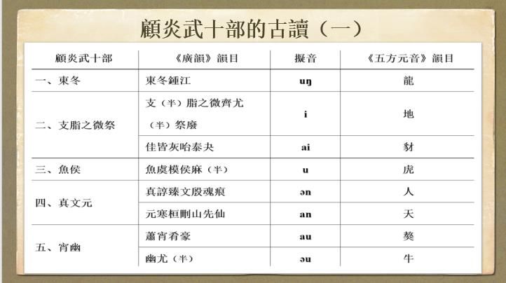 顾炎武的古音研究体现在《诗本音》《易音》和《唐韵正》中注明的古读。赵老师从分析《诗本音》中顾氏所注古音入手,指出顾氏注音虽然袭用《广韵》的韵目,但是却不可能按照《广韵》的分韵去读,只能按照当时的某种语音去读。赵老师根据学理推测,认为这种语音是当时比较通行的官话的发音。在此基础上,赵老师以近代比较有代表性的官话韵书《五方元音》作参照,对顾炎武的古韵分部作了拟音。