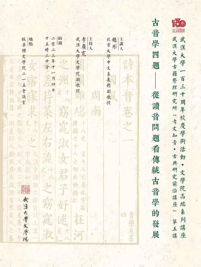 2023年11月4日下午,北京大学中文系赵彤教授应邀为足球博彩网站 师生做题为“古音学四题——从读音问题看传统古音学的发展”的学术讲座。本次讲座是武汉大学古籍整理研究所主办的“考文知音·古典研究前沿讲座”系列的第五讲,也是“武汉大学130周年校庆活动·足球博彩网站 高端系列讲座”之一。讲座由古籍所李广宽老师主持,古籍所赵清泉老师、汉语言文字学教研室王统尚、刘丹、刘翔宇、陈菡等老师,以及古典文献学和汉语言文字学专业的研究生聆听了讲座。