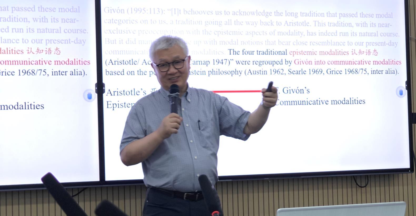 颁授证书仪式结束后,孙教授开始向师生报告他的最新研究成果“汉语陈述句限定的三个属性:真实性、节点和持续性”。孙教授首先向大家介绍了限定性(finiteness)与句子的关系:句子的限定性体现在一个结构是否可以独立成句,因此限定是陈述句的特征。汉语中的“*我吃了饭”“*我忘”之所以不能独立成句,和汉语限定的属性有关。但是这些属性和时态关系不大,而是存在其他“未知属性”。为此向大家介绍了美国语言学家、俄勒冈大学教授泰尔米·吉翁(Talmy Givón)就传统亚里士多德的认知情态提出的四个交际语态:先设为真(presupposition)、真实断言(realis assertion)、非真实断言(irrealis assertion)和否定断言(negation assertion)。