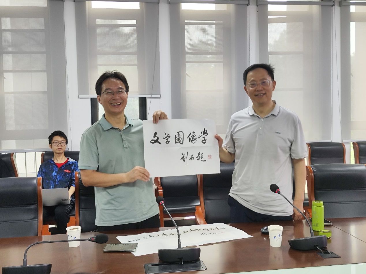 讲座正式开始前,刘石教授向吴光正教授赠予了“文学图像学”、“中国宗教文学与宗教文献研究中心”两幅题字。