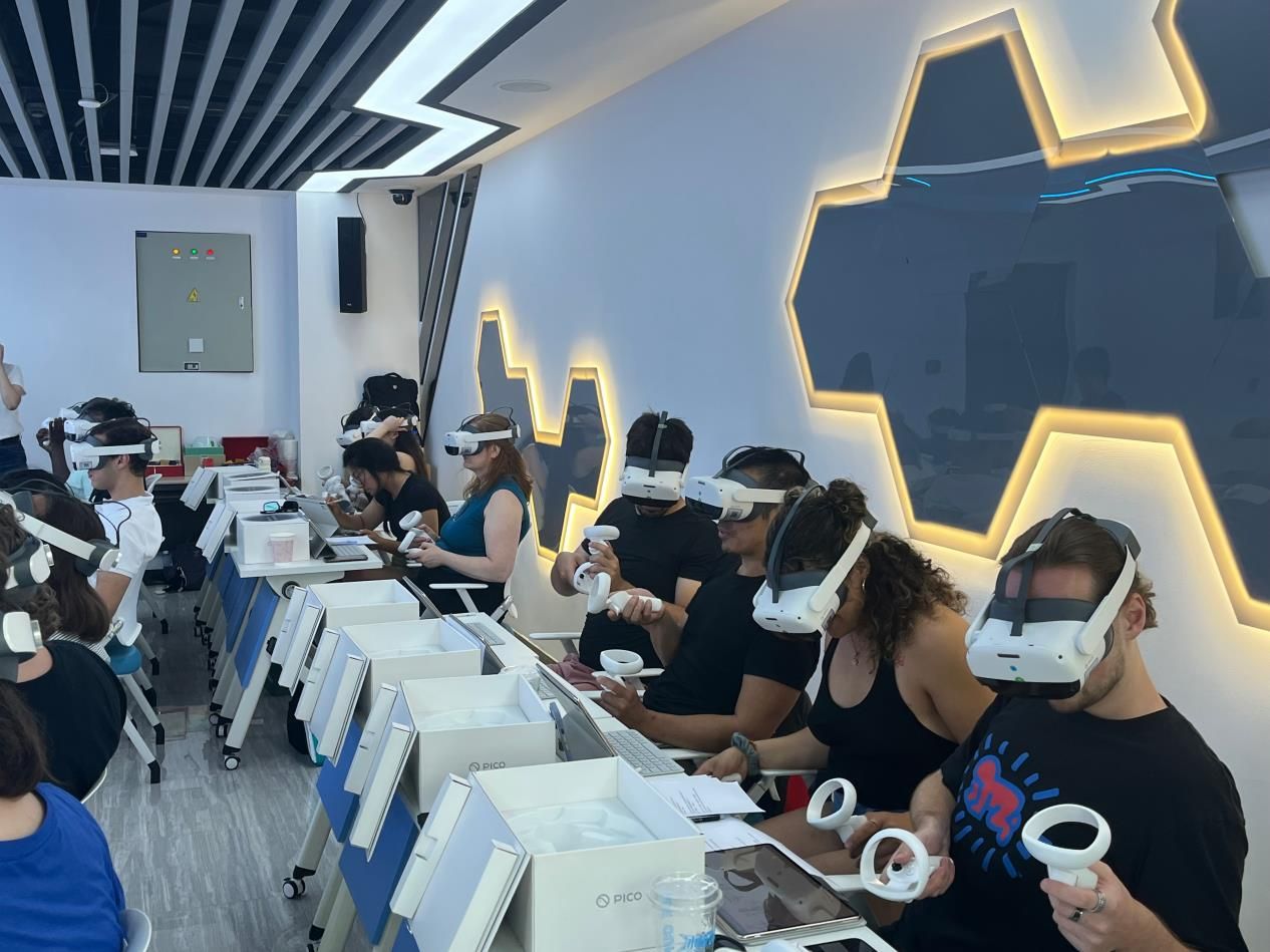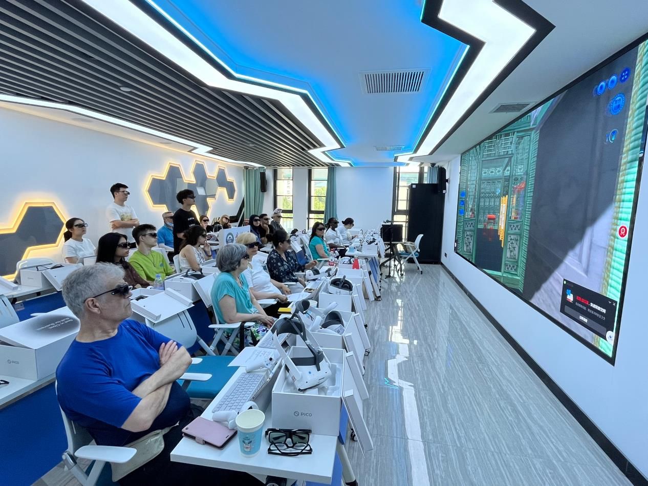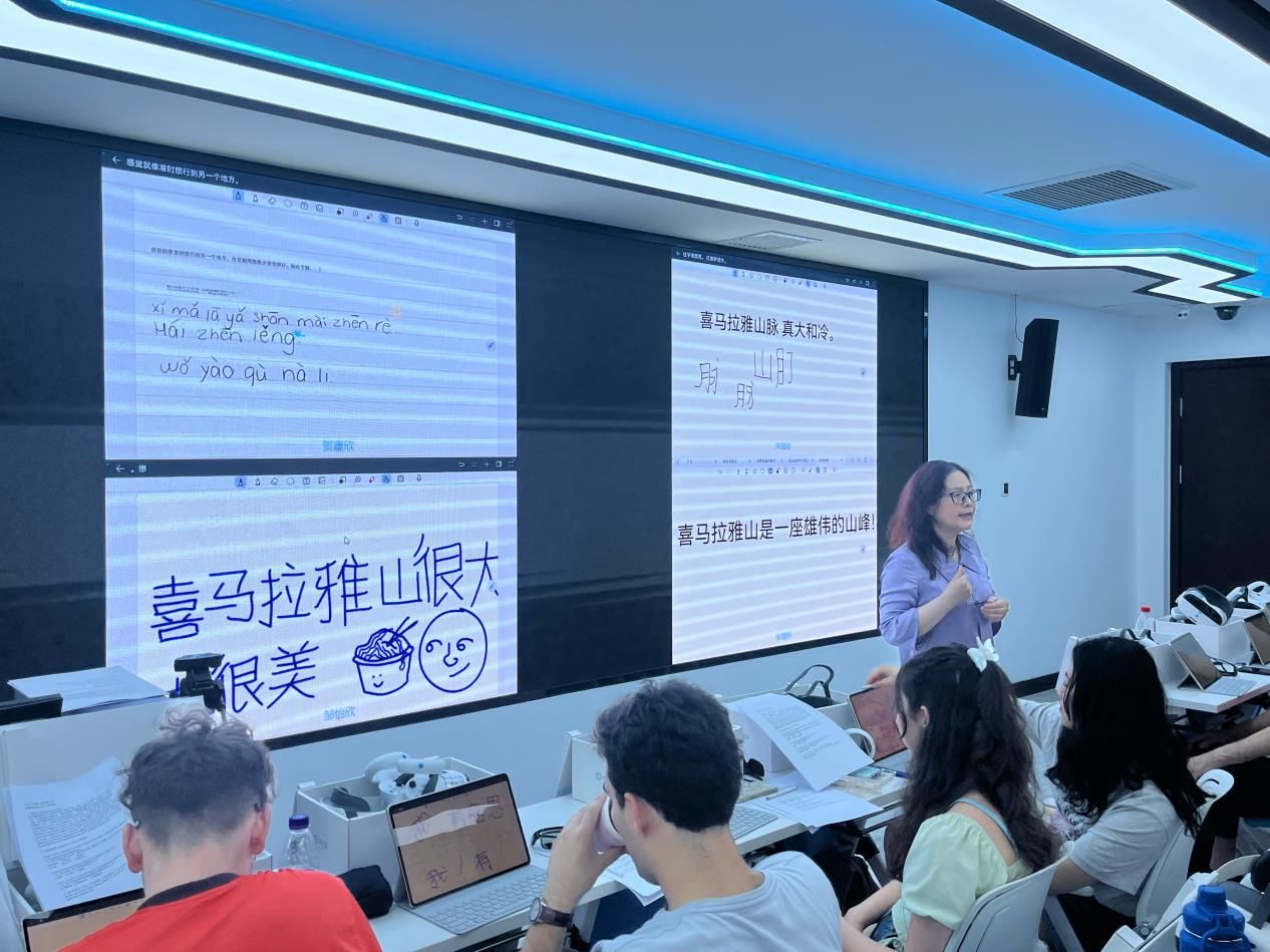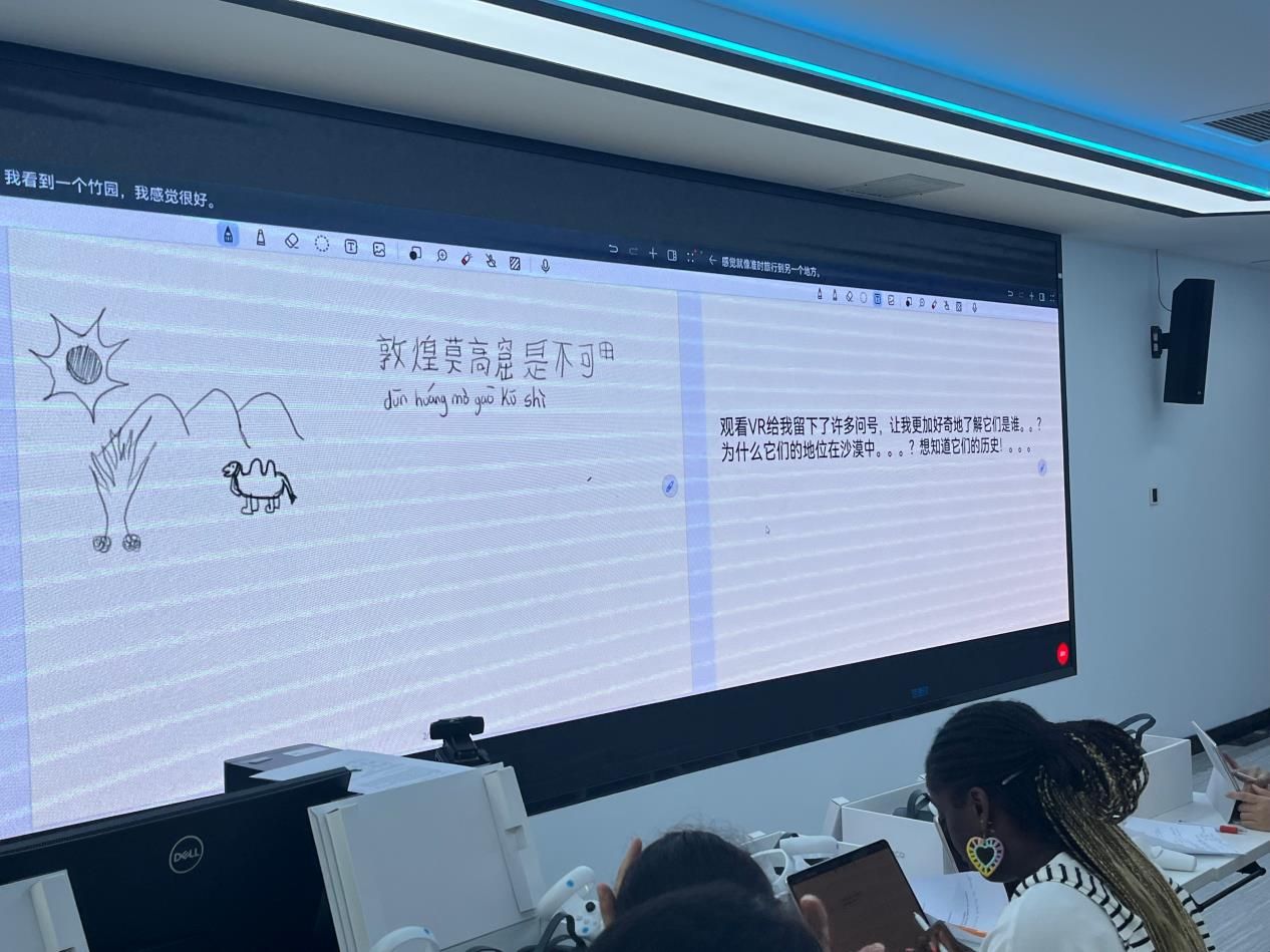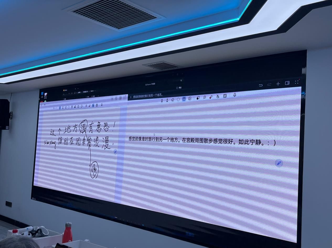 基于这些丰富多样的虚拟现实场景,萧映老师指导学员进行即兴汉语写作练习。她鼓励学员运用汉语,将虚拟世界中的见闻转化为文字,放飞想象力与创造力,表达个人独到的感受,并将学员的写作练习通过投屏的方式在实验室大屏幕上展示出来,师生互动交流。这种写作练习不仅激发了学员对中国文化的共鸣与喜爱,也显现了人工智能在文学创作中的新颖应用。