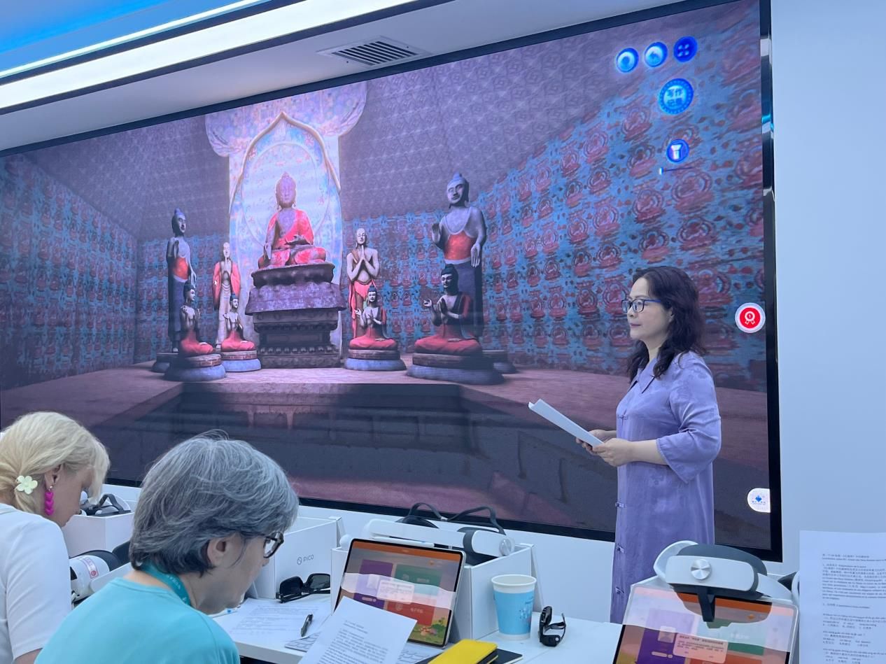 在实验室中,学员戴上沉浸式VR体验器、立体3D眼镜,穿梭于精心构建的虚拟世界——时而漫步于清幽雅致的“大观园”,感受中国古典园林的悠长韵味;时而置身于壮丽辉煌的“敦煌莫高窟”,领略建筑、雕塑、壁画三者结合的立体艺术;时而又攀上雄伟神秘的“喜马拉雅山”,在雪山之巅寻找灵感,让思绪随云海翻腾,无限延伸。